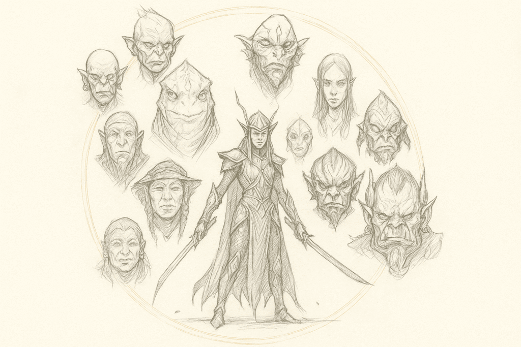 - Elves: High elves (arcane mastery), wood elves (nature and stealth), drow (dark and mysterious).